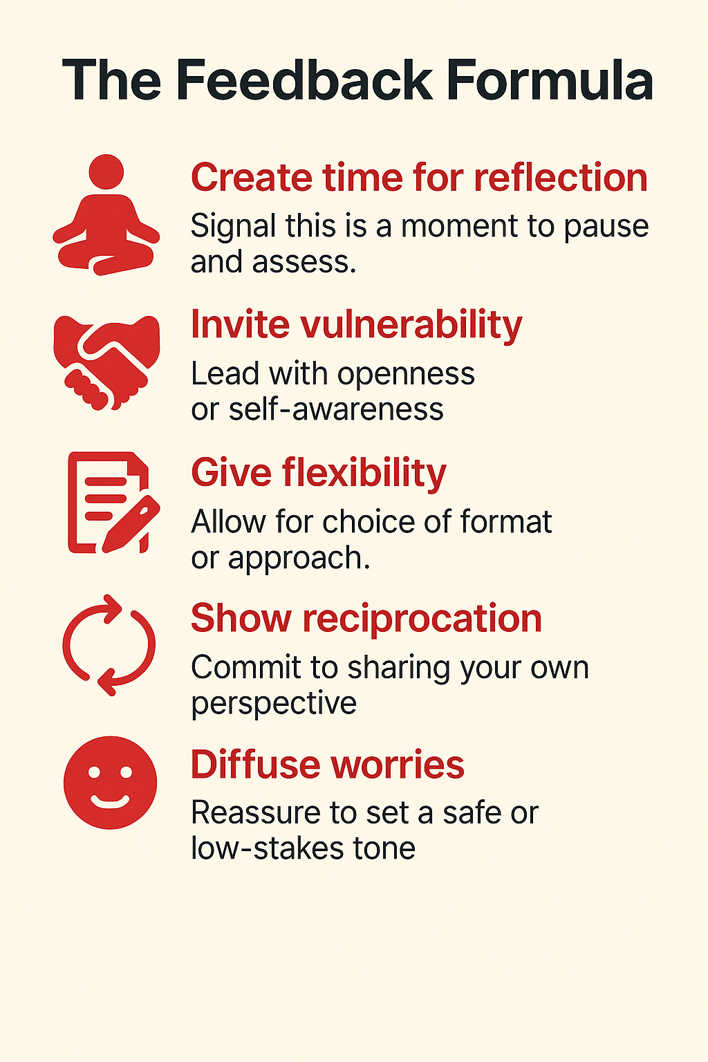 Example: “<create time for reflection>Hey, we’ve been working on project X for a while, and I was thinking for our next 1:1, we could share perspectives on how our collaboration is going. <Invite vulnerability>. For example, I’ve recently been working on giving teammates more space to work through problems versus driving in, among other areas I’d love your input on. <give flexibility> I’m open to sharing perspectives in advance, in writing, or in person if you prefer. <show reciprocation> I’ll also share perspectives with you so we can continue to work better together <diffuse worries>. FYI, if I had something critical or red to share, I would have already shared it!